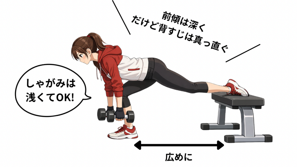 背筋を伸ばしたまま、股関節から折り曲げるイメージで上体を“床と平行に近くなるまで”前に倒します。