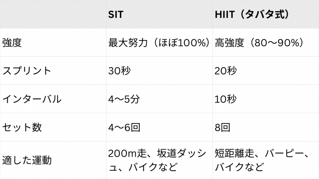 一般的なHIITのプロトコル「タバタ式」を比較対象にするなら、SITの方がスプリントの強度が高く、その分インターバルが長いといったイメージです。