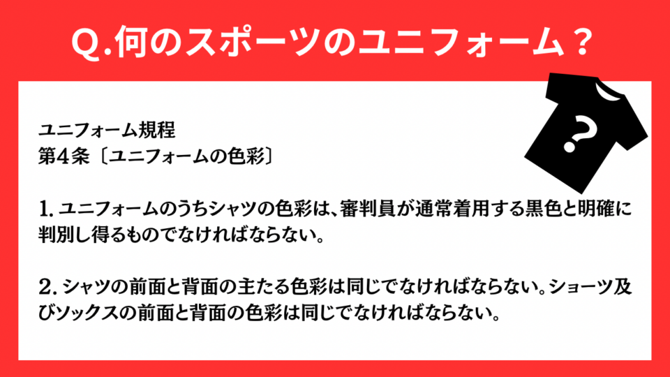 以下の文言は、あるスポーツ競技の試合における「ユニフォーム規程(※)」の一部となります。それぞれ何のスポーツのユニフォーム規程か当ててください。