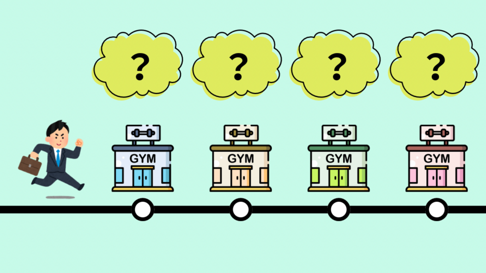この4つの駅の前には、それぞれ「チョイザップ」「エブリタイムフィットネス」「ヨイフィット」「オオナミスポーツ」というジムがあり、Aさんは自宅の最寄り駅の前にあるジムに通っています。