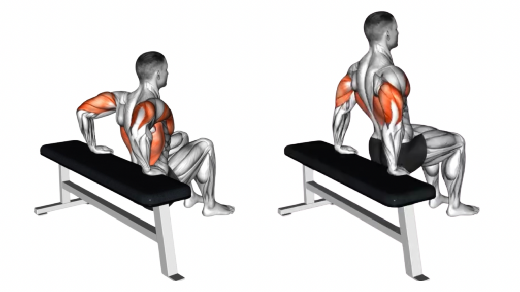 自重を使い、腕の裏側をしっかり鍛える種目。肘を90度に曲げるまで下げることで、三頭筋にしっかり効かせることができます。