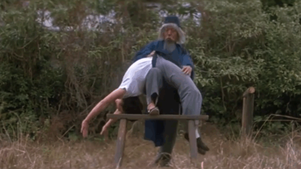 師匠(ユエン・シャオティエン)を乗せて木製のバーの上でヒップリフトをするガンフー。少しでもペースが落ちるとキセルをお尻に押し付けられる。