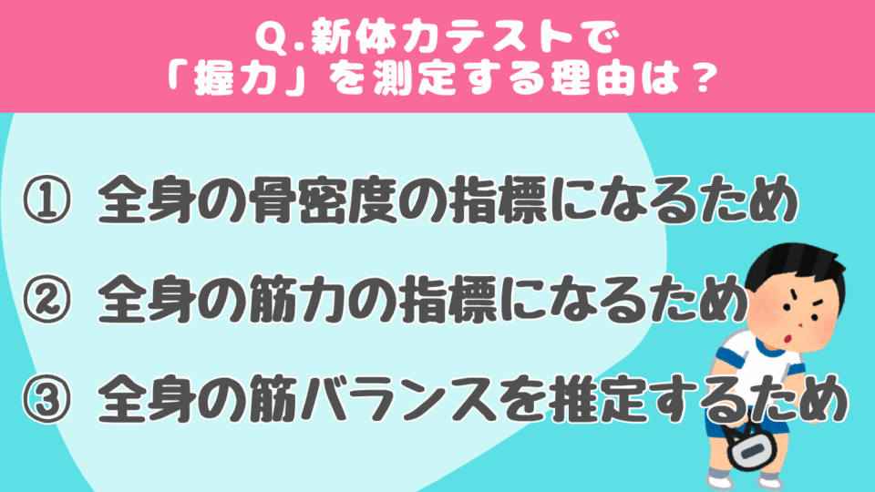 握力は一見「手の力」だけのように思えますが、全身の筋力と強く相関することが分かっています。そのため、体全体の筋力を推定する代表的な測定項目とされています。