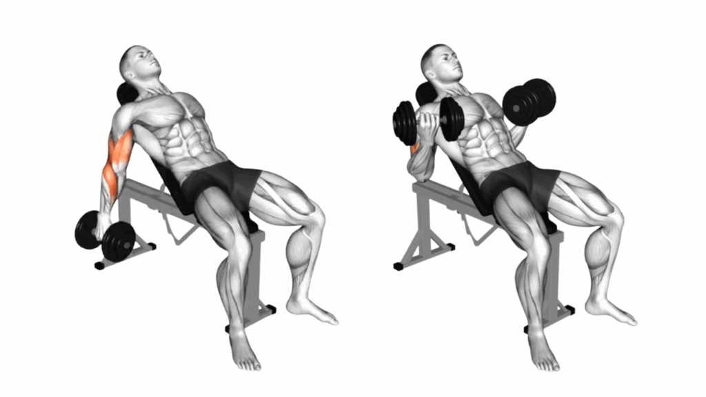 背もたれの傾斜があるベンチに背を預けた状態で行うダンベルカール。腕が後ろに引かれたポジションで始動でき、二頭筋にストレッチがかけられます。