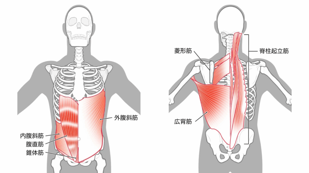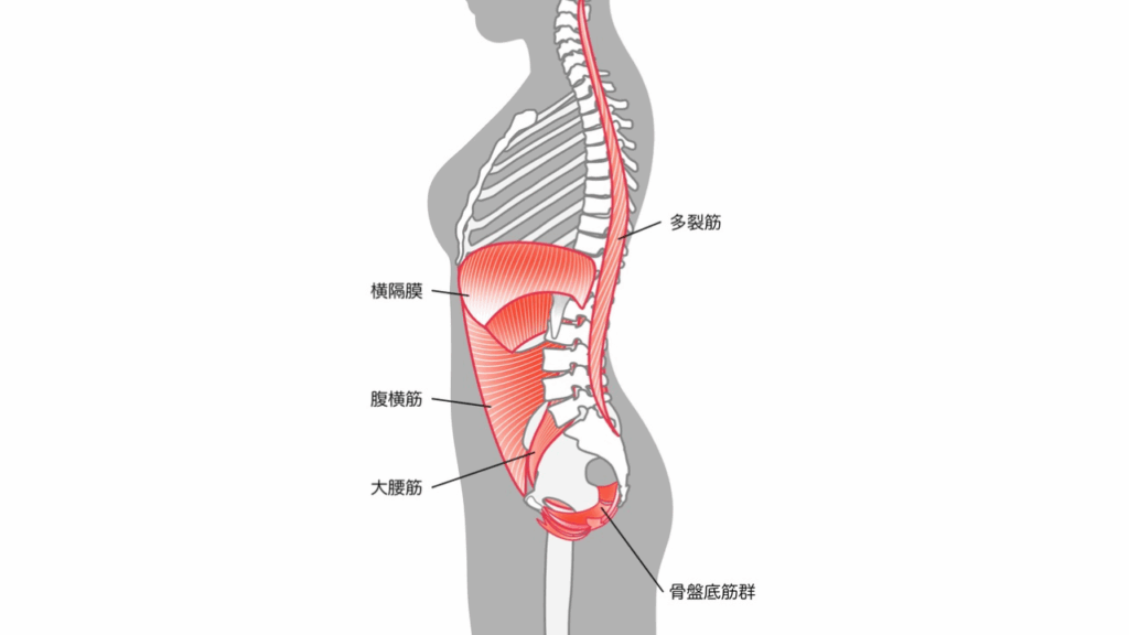 これらがバランスよく働くことで、体幹が筒のように安定し、重い物を持ち上げるときや姿勢を保つときに身体を守ってくれます。