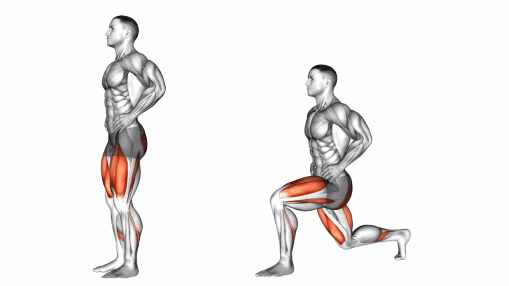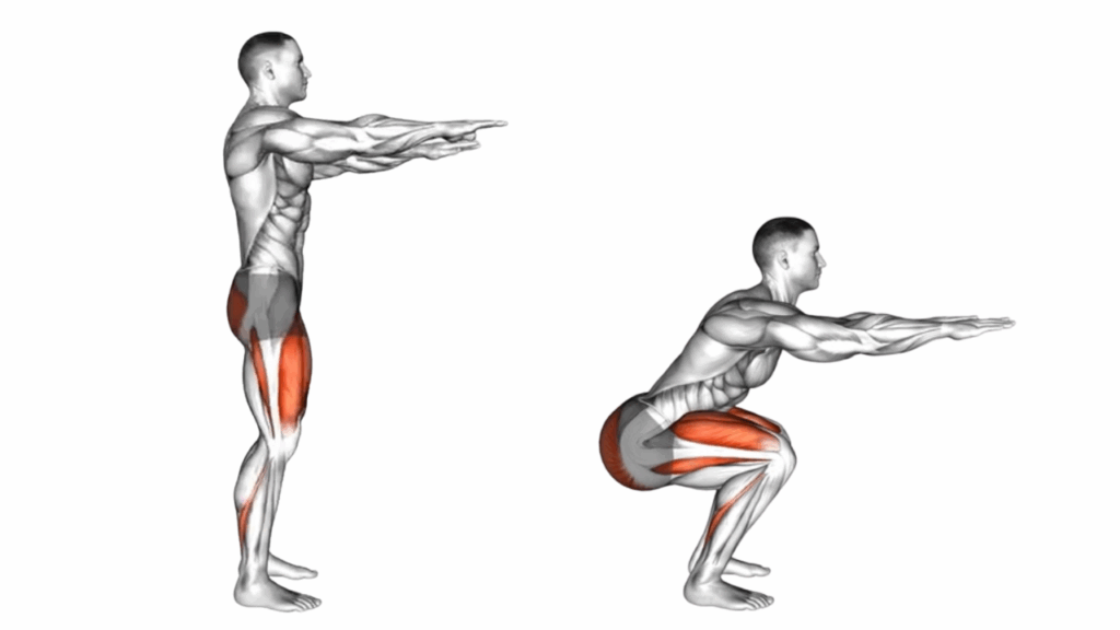 鍛える部位:太もも前(大腿四頭筋)、太もも裏(ハムストリングス)、お尻(大臀筋)