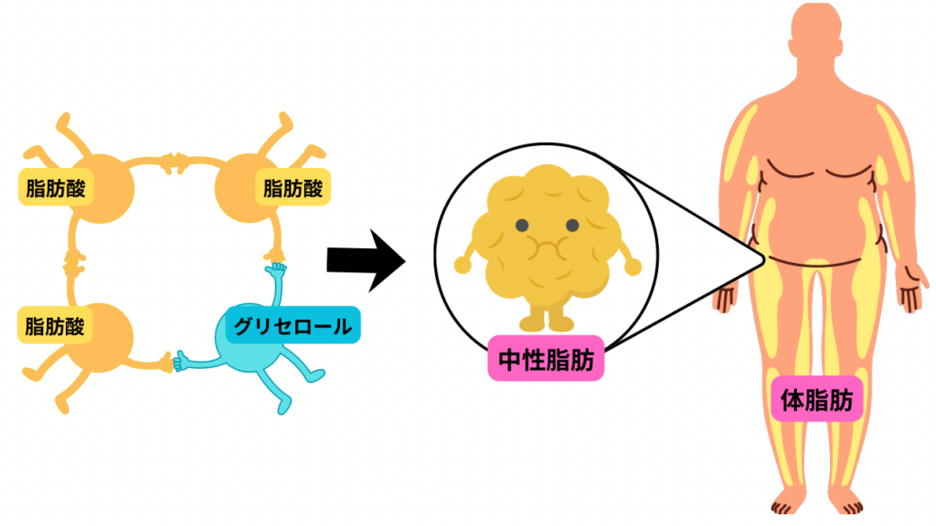 結論から言うと「体脂肪」の主成分が「中性脂肪」で、その材料が「脂肪酸」です。