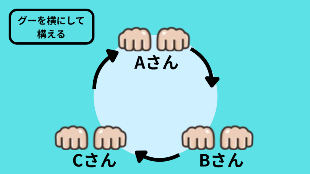 5. これを時計回りなどで繰り返していき、先に予想を2回当てて両手とも下ろすことができた人が勝ちです。
