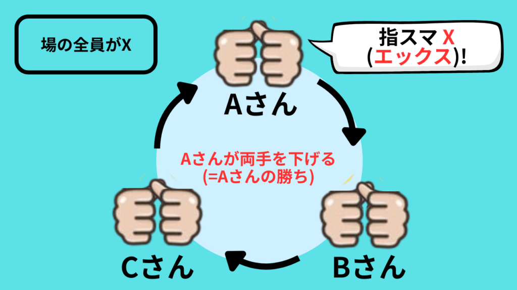 - 「X」と宣言して全員が「X」を出していたら、宣言した人は両手を下げることができる(=その時点で勝ち)