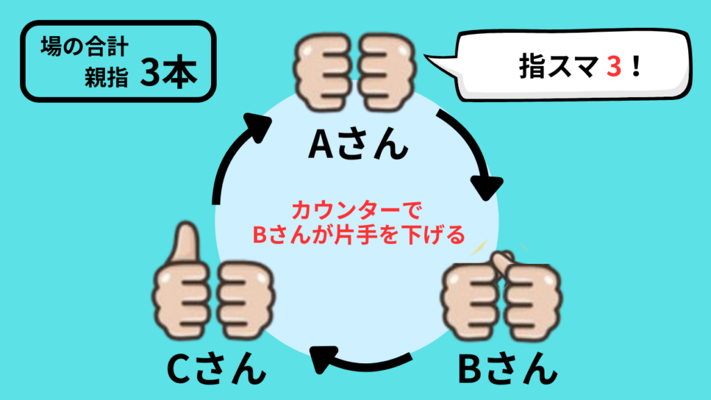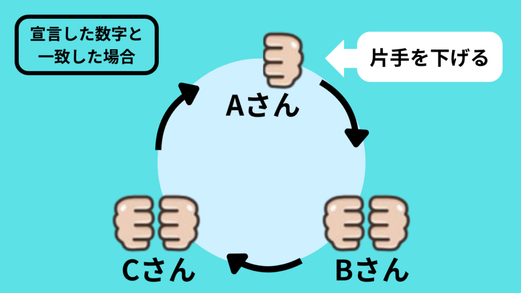 4. 宣言した数字と立った親指の合計が一致したら、宣言した人は片手を下ろします。