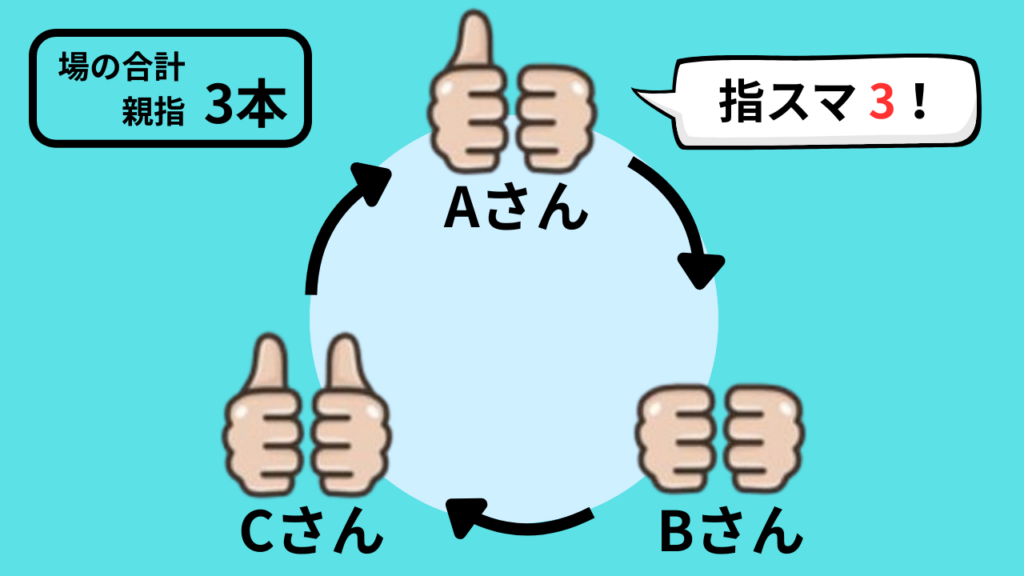 3. 参加者は1人ずつ順番に「指スマ〇!」(◯はその場に立つと予想した親指の合計本数)と宣言します。